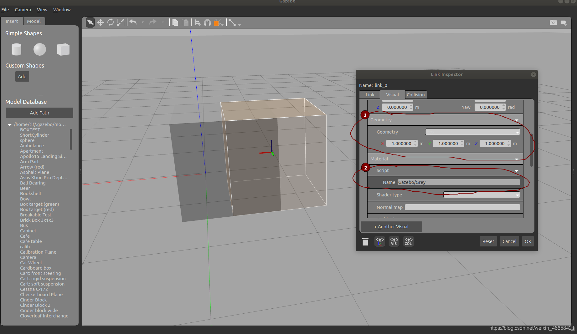 ()圈1框里可以设置灰色的部分(实际视觉部分)的长宽高(x,y,z),圈2框里的可以通过改Name来设置视觉部分的颜色(比如可以改成:Gazebo/White,白色)