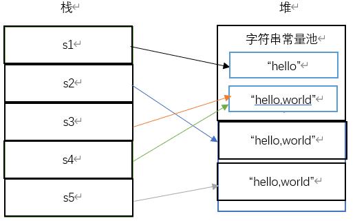 如果是字面值创建的方式,如 String s4=”hello,world”,JVM会先去字符串常量池中寻找有没有“hello,world”这个字符串,若有,则将其地址给 s4;若没有,则先在常量池里创建“hello,world”,然后再把地址给s4;而通过 new 的方式创建对象,则是在堆中创建“hello,world”对象,s5 指向这个对象。还是看图吧,比较直观: