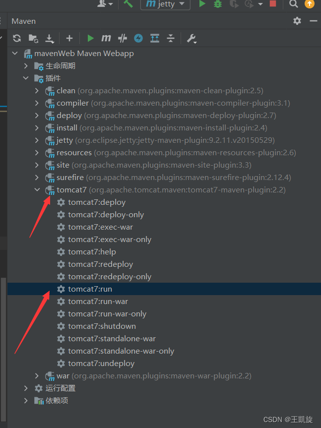 <!– Tomcat插件 –> <plugin> <groupId>org.apache.tomcat.maven</groupId> <artifactId>tomcat7-maven-plugin</artifactId> <version>2.2</version> <configuration> <!–配置端口号–> <port>80</port> <!–配置项目路径–> <path>/mavenWeb</path> </configuration> </plugin>