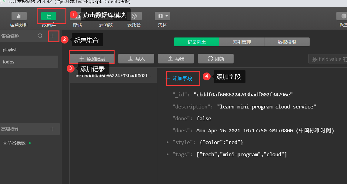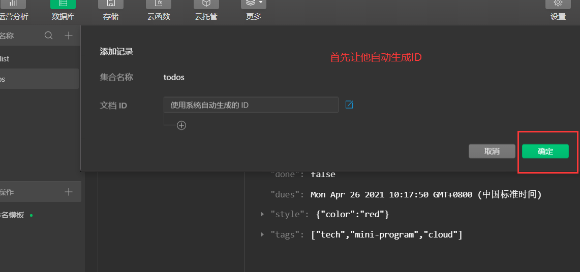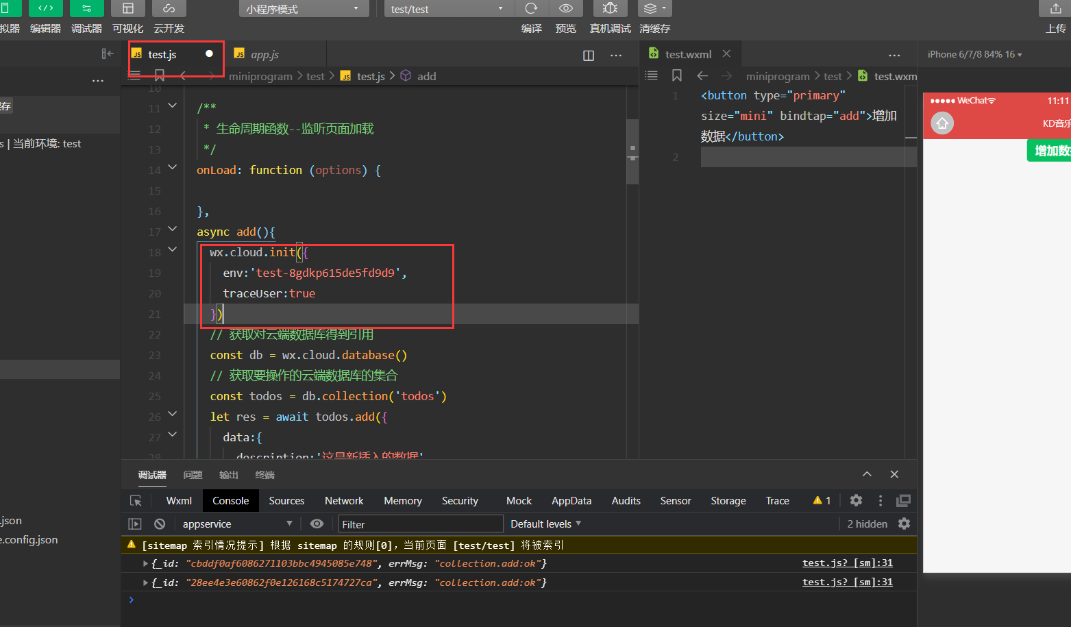 async add(){ // 获取对云端数据库得到引用 const db = wx.cloud.database() // 获取要操作的云端数据库的集合 const todos = db.collection('todos') let res = await todos.add({ data:{ description:'这是新插入的数据', done:false, due:new Date(), tags:['hello','world'], style:{color:'blue'} } }) console.log(res); }, -