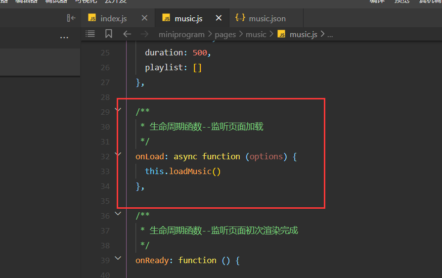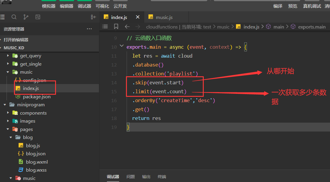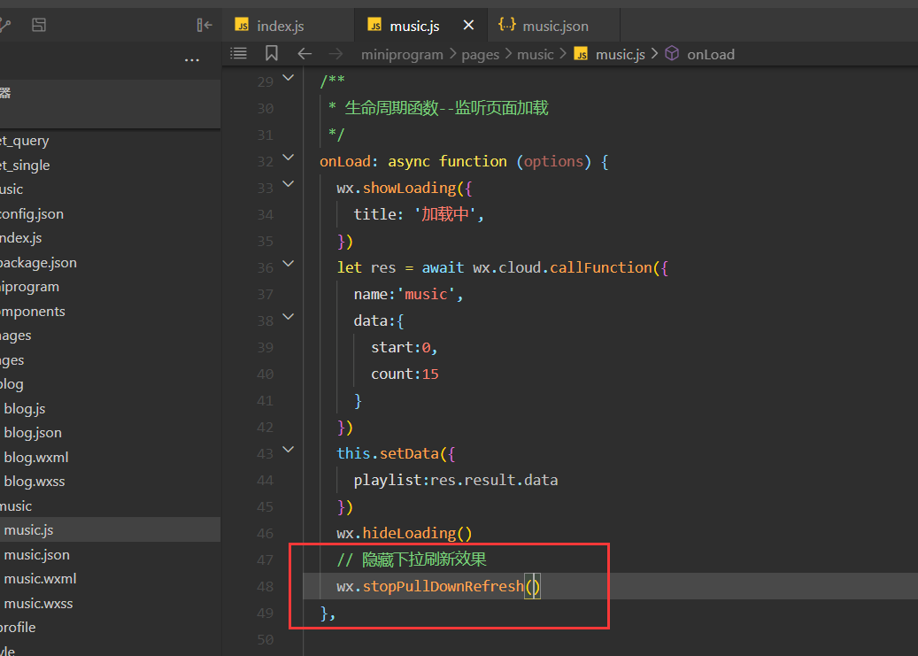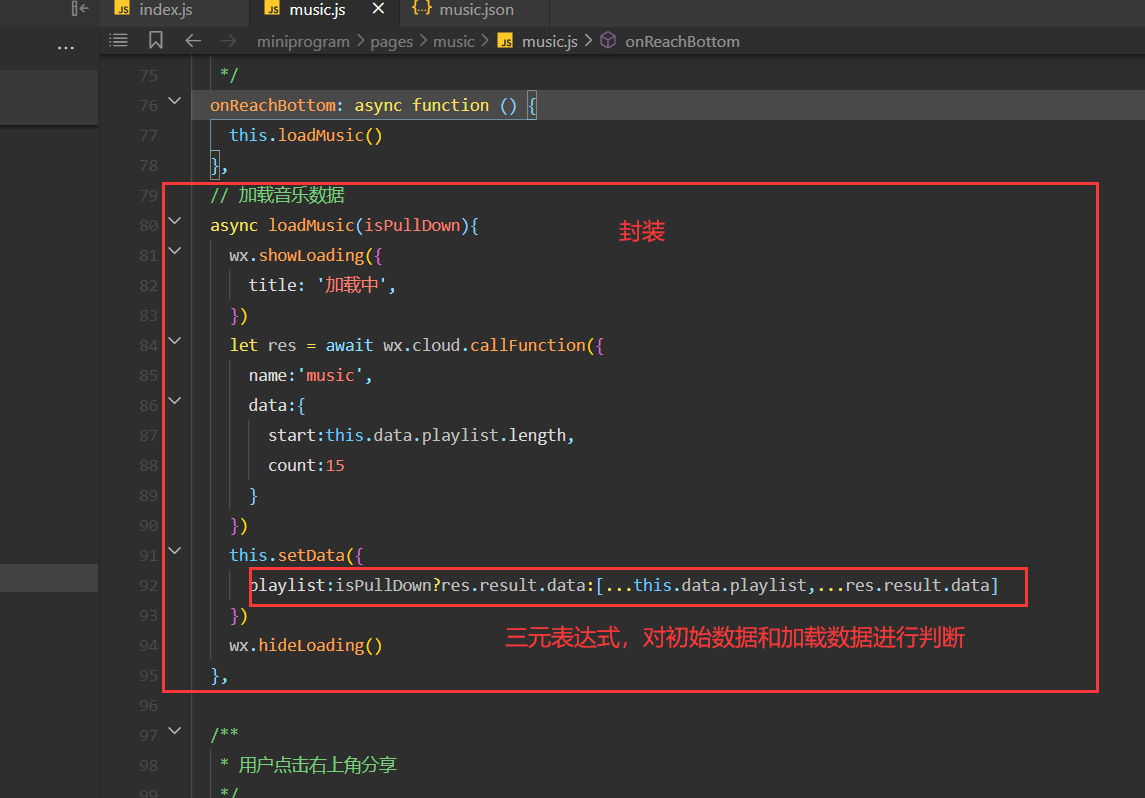 /** * 页面上拉触底事件的处理函数 */ onReachBottom: async function () { wx.showLoading({ title: '加载中', }) let res = await wx.cloud.callFunction({ name:'music', data:{ start:this.data.playlist.length, count:15 } }) this.setData({ playlist:[...this.data.playlist,...res.result.data] }) wx.hideLoading() },