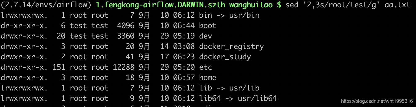 sed ‘2,3s/root/test/g’ aa.txt sed ‘2,$s/root/test/g’ aa.txt $匹配输入字符串的结尾位置。