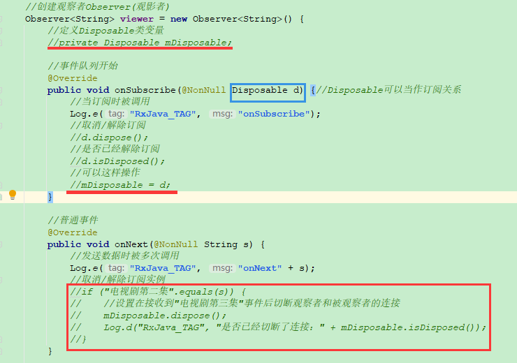 在创建观察者的时候,在onSubscribe()方法可以看见Disposable(如下图蓝标代码),可以把Disposable当作订阅关系