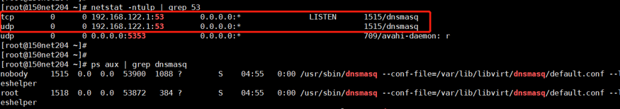 注意:如果系统安装时选用非最小化安装,系统会已经默认安装dnsmasq,为系统默认的虚拟网桥virbr0提供服务,并且53端口已经占用,无法启动,