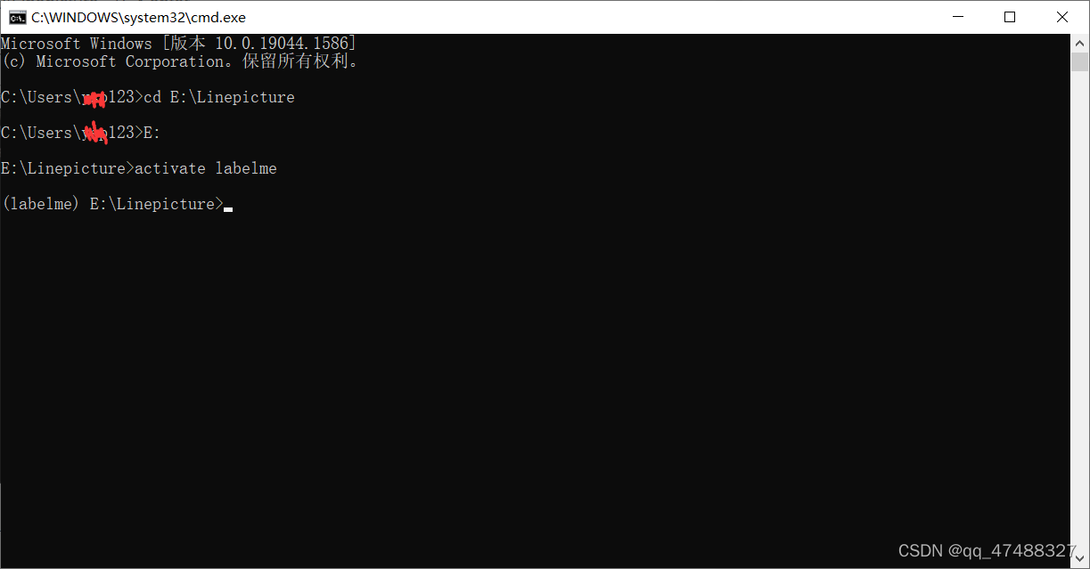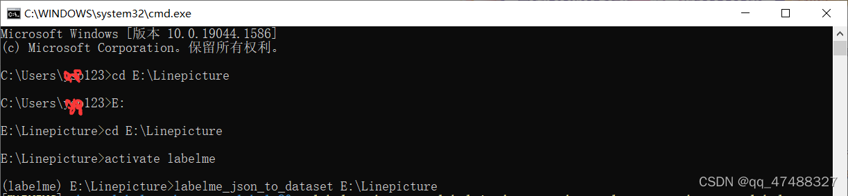 这时我们就可以输入转换文件所需的代码了 。如下: labelme_json_to_dataset+空格+文件夹路径。如我的就是labelme_json_to_dataset E:\Linepicture 如下如图