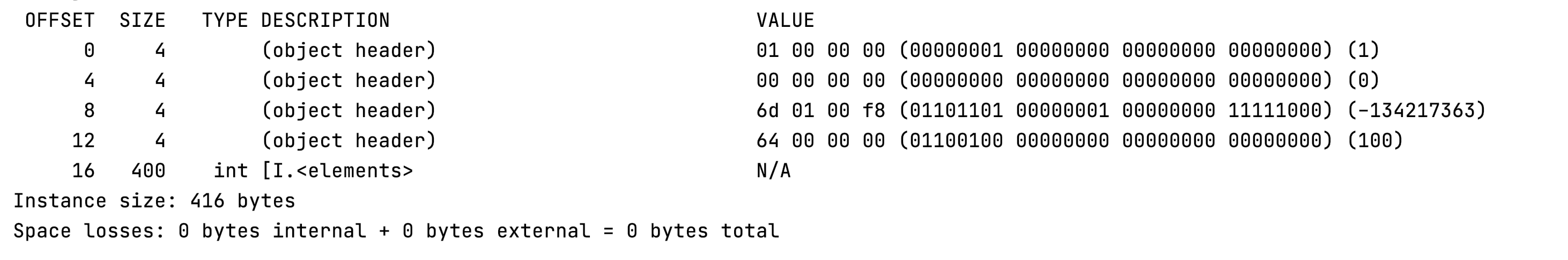 这是一个初始化为100长度的数组对象,我们可以看到在数组对象的对象头中多一个