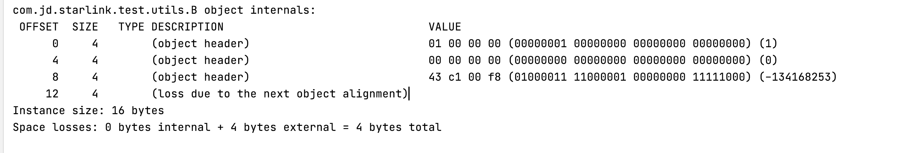 System.out.println(ClassLayout.parseInstance(b).toPrintable());
