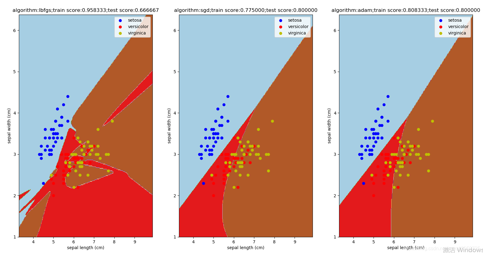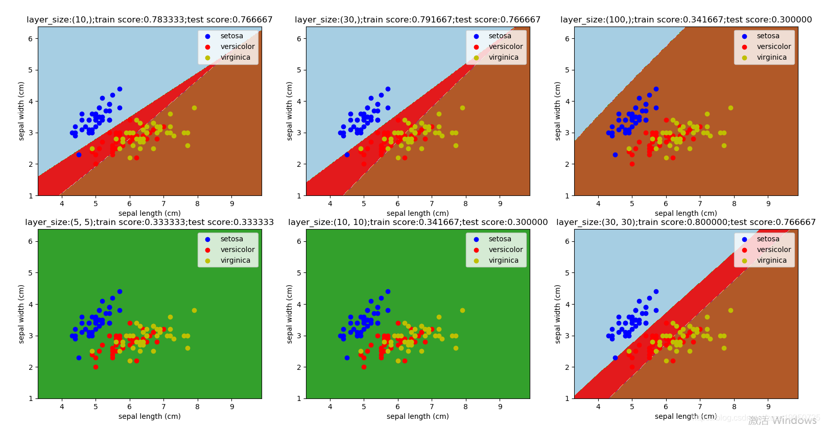 下面观察激活函数对多层神经网络分类器的影响:调用函数mlpclassifier_iris_ativations(),可以看到不同激活函数对性能有影响,但相互之间无显著差别。