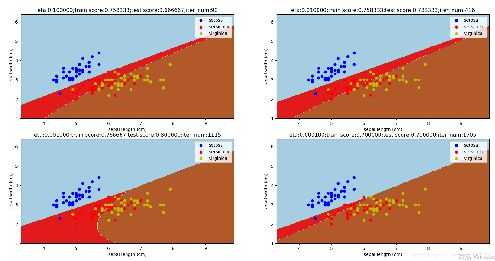 X=iris.data[:,0:2] 表示使用前两个特征(sepal length和sepal width),因为两个特征方便在二维图形上表现出来,横轴为:sepal length,纵轴为:sepal width。对数据进行混洗,最后取出最后的30个数据作为测试集。