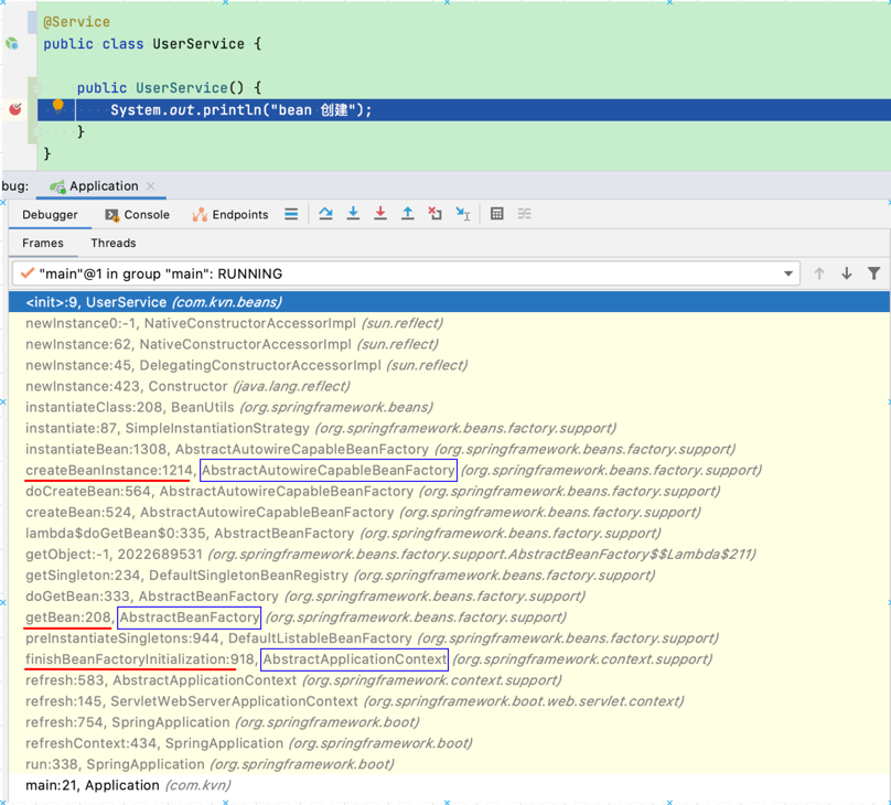 从调用堆栈中,可以看到,bean 实例的创建是在执行