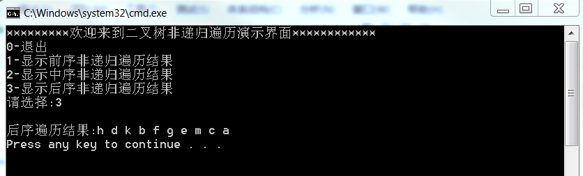 printf("*********欢迎来到二叉树非递归遍历演示界面************\n");