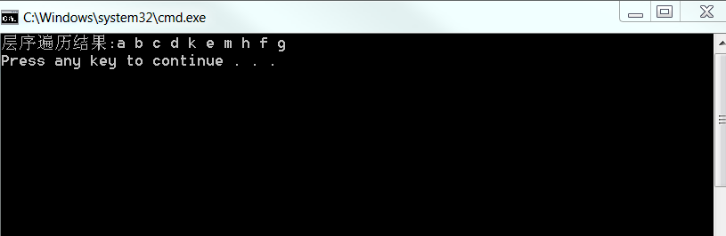 - 这是一个完整可以执行出结果的代码,不过我们重定义了标准输入为“data.txt”,因此运行这段代码之前你需要在程序所在的文件夹内创建名为“data.txt”的文件,并将”abd#h##k##cef##g##m##”写入该文件保存(字符串不含引号),然后程序就可以直接从“data.txt”文本中读入二叉树的数据,并将按层序遍历的结果输出。演示结果为: