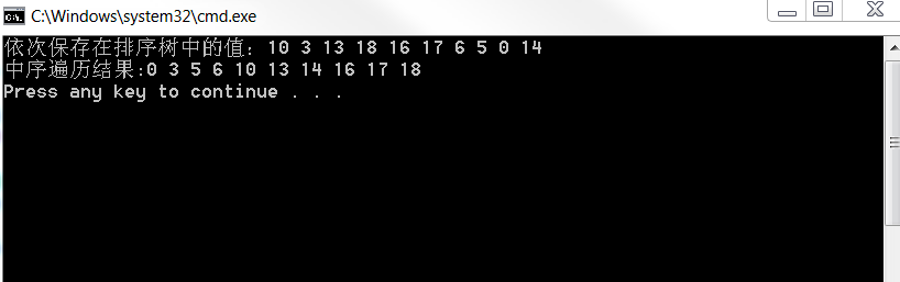 - 我们采用在main()函数中随机生成0-19之间的数字的方式来构建二叉排序树,树中的结点一共有10个,并且要求结点之间没有重复的值。随机函数生成的值及排序结果输出如下图:
