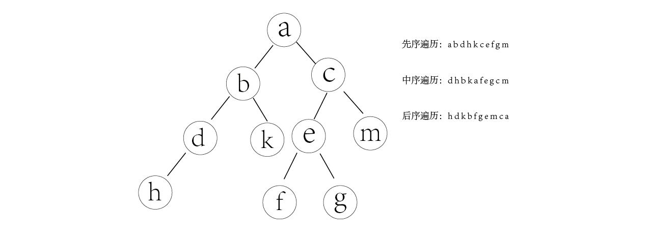 在前序遍历生成二叉树中,我们用‘#’表示结点为NULL,因此前序遍历生成二叉树时的输入序列应该为:”abd#h##k##cef##g##m##”。通过CreateTree()函数我们就建立起了一颗如上图所示的二叉树,然后就可以愉快的开始各种遍历测试了,具体代码如下: