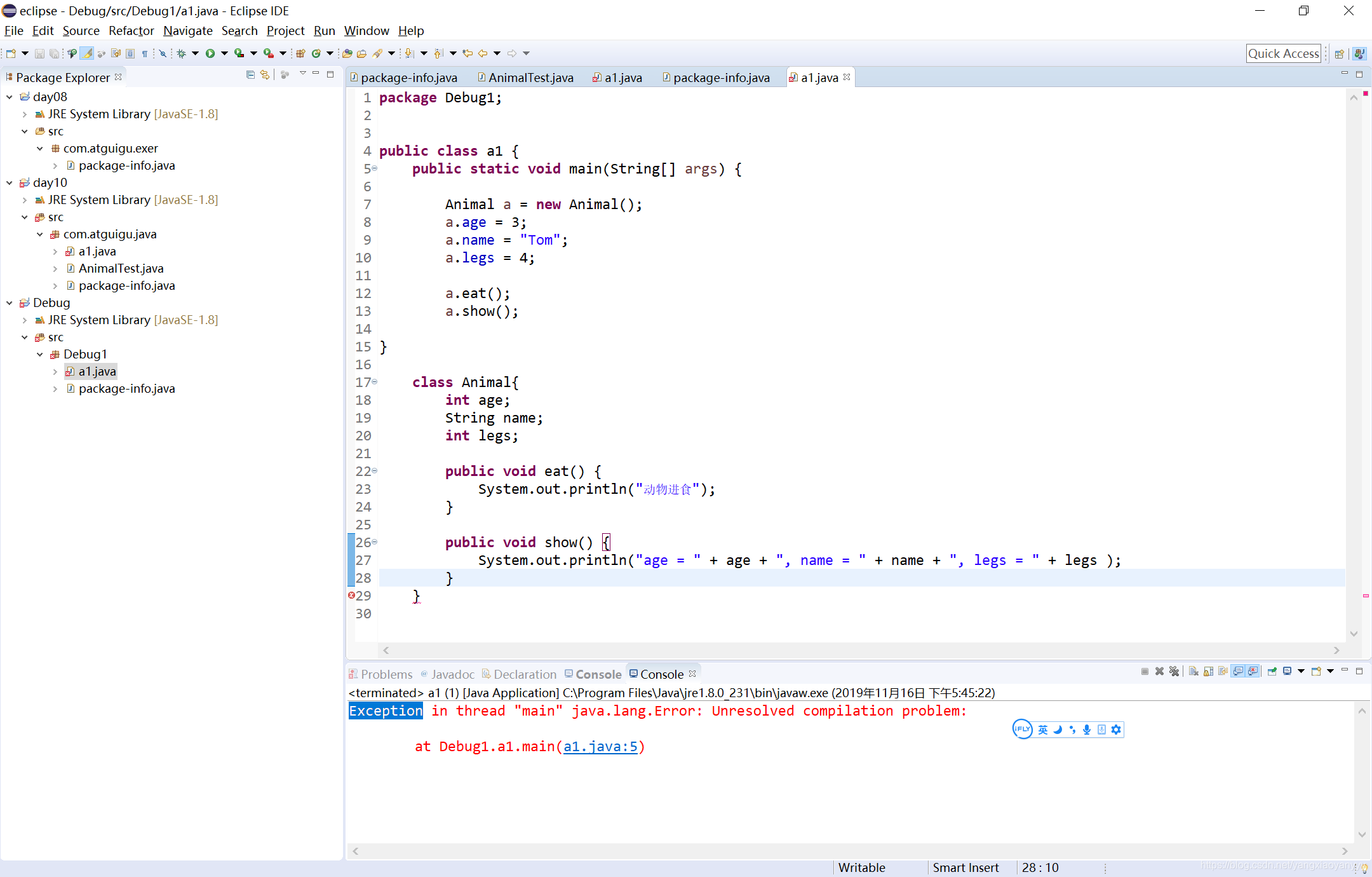 在class a1 中,main方法没有对应的}