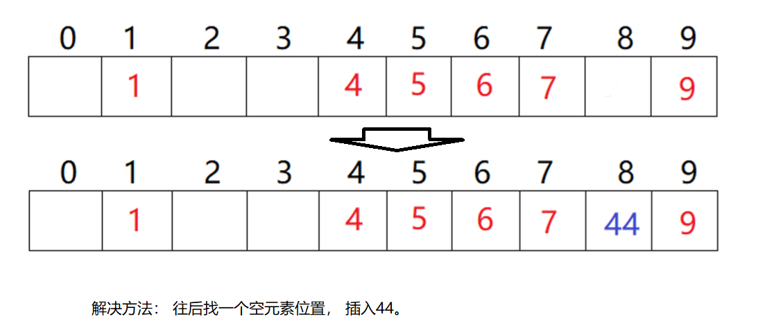 解决方法:如果插入的元素发生冲突,代表它这个位置已经被占用, 我们使用线性探测找下一个空位置, 然后插入该元素, 解决哈希冲突。