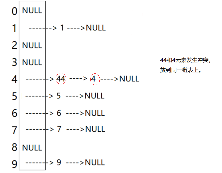 举个例子: 之前容量为10, 插入元素4、14都是同一位置,有冲突。