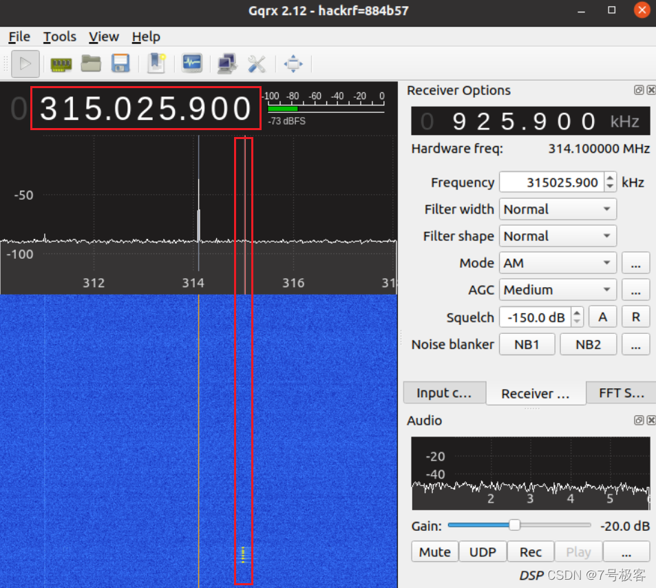 在桌面右键打开命令行终端,输入gqrx命令,即可打开gqrx工具GUI界面。