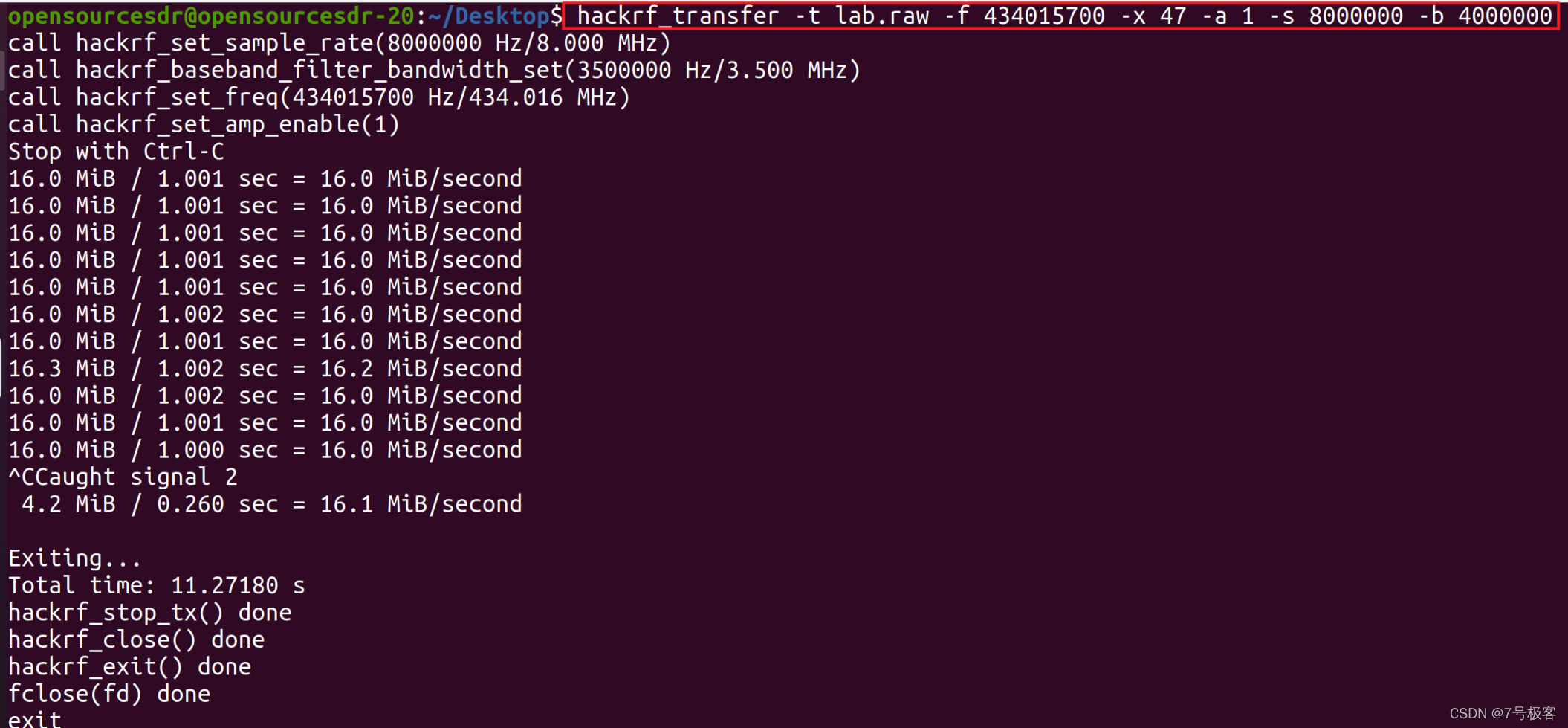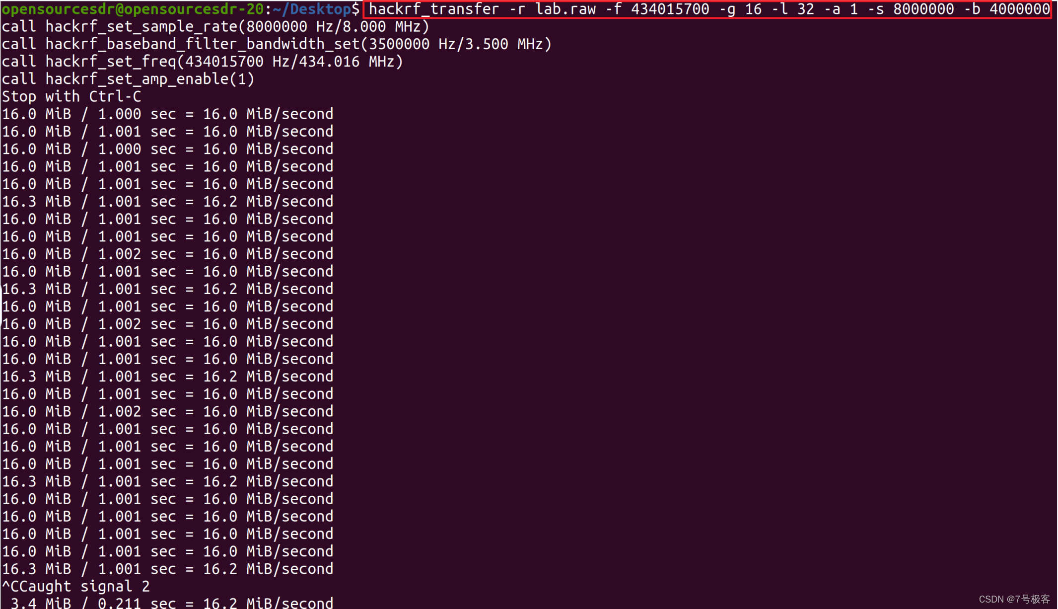 执行命令后,把遥控器靠近HackRFOne设备,然后按开门按键几次,然后在命令行窗口按Ctrl + C可完成录制。