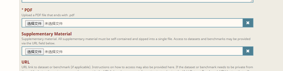然后需要注意的是,这里的PDF只能一份文件,且supplementary material有大小限制。