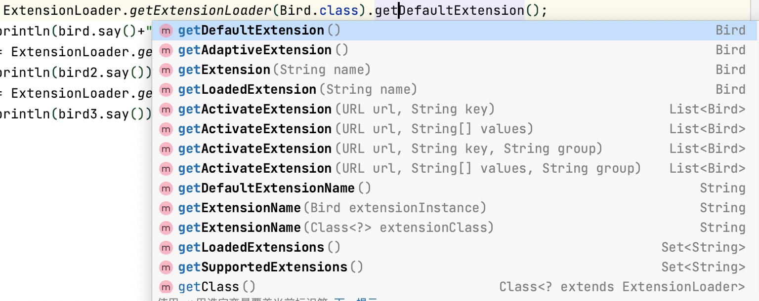 Bird bird = ExtensionLoader.getExtensionLoader(Bird.class).getDefaultExtension();