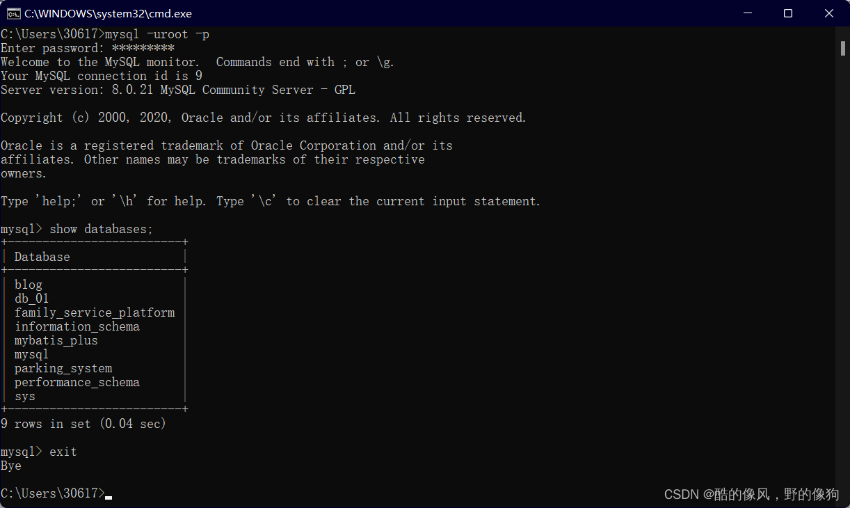 mysql -hlocalhost -uroot –p 或者 mysql -hlocalhost -uroot –p123456