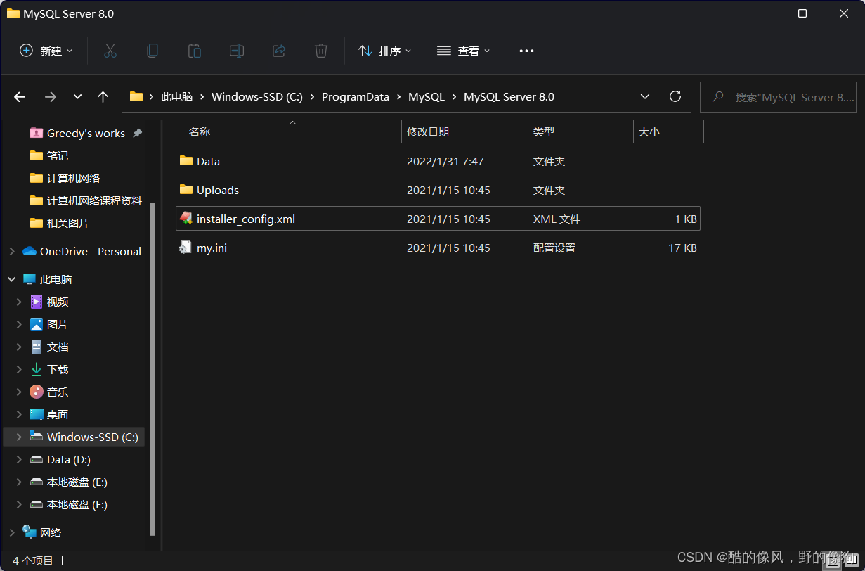 - datadir=C:/ProgramData/MySQL/MySQL Server 8.0\Data:数据文件夹位置