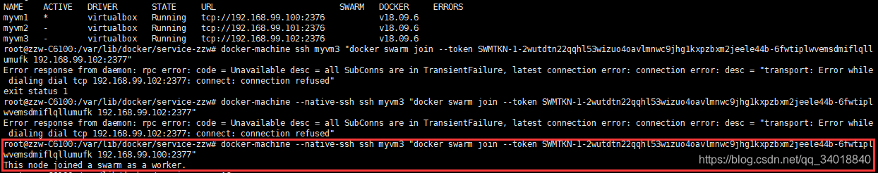 #root@zzw-C6100:/var/lib/docker/service-zzw# docker-machine --native-ssh ssh myvm3 "docker swarm join --token SWMTKN-1-2wutdtn22qqhl53wizuo4oavlmnwc9jhg1kxpzbxm2jeele44b-6fwtiplwvemsdmiflqllumufk 192.168.99.100:2377"