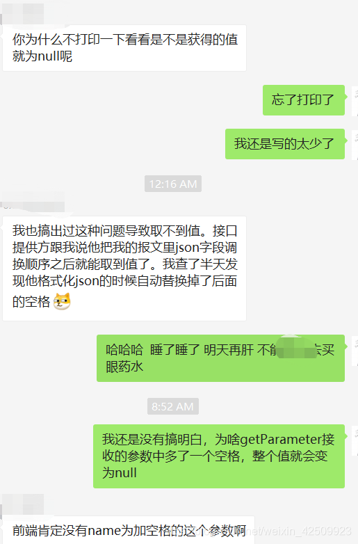 后来一位群友发现了我在接收参数的时候后面多了一个空格!附上聊天截图,对我而言简直就是段“艰辛的奋斗史”