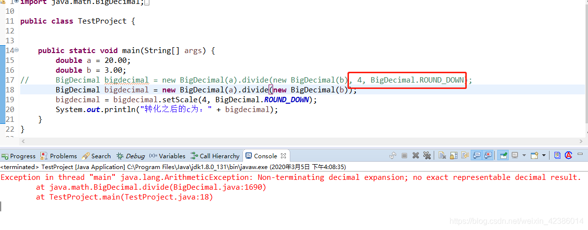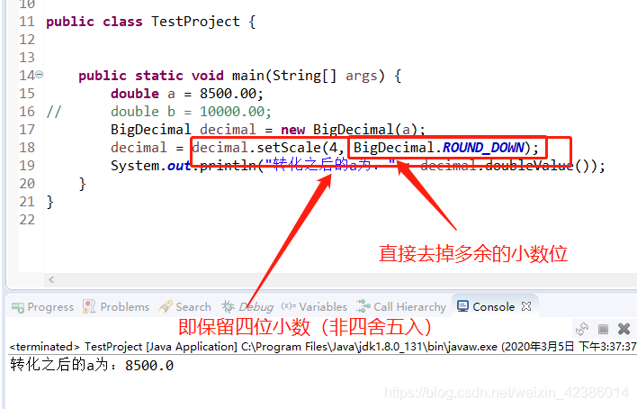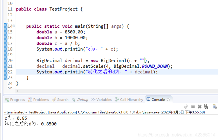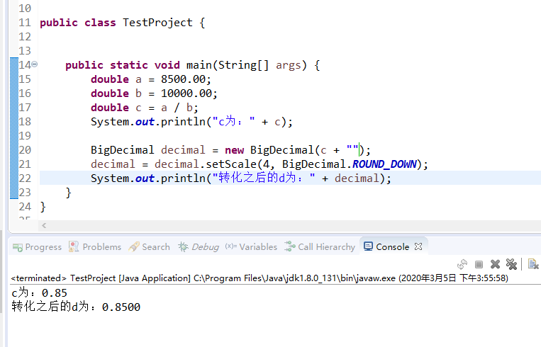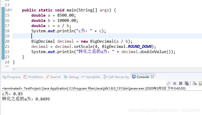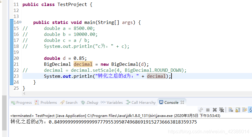 我们会发现,当我们直接打印出 a / b 时,此时未做转换,c 为 0.85;但是当我们把 a / b 的结果放入构造方法中时(即把0.85放入构造方法中),会发现,最后通过BigDecimal对象转化出的double数据为0.8499;