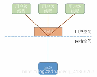 多对一模型:多个用户及线程映射到一个内核级线程。每个用户进程只对应一个内核级线程。