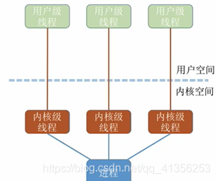 一对一模型:一个用户及线程映射到一个内核级线程。每个用户进程有与用户级线程同数量的内核级线程。