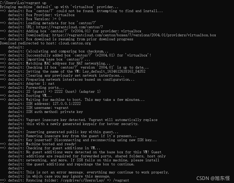 第二步,输入vagrant up命令启动CentOS7,第一次启动会安装CentOS7。