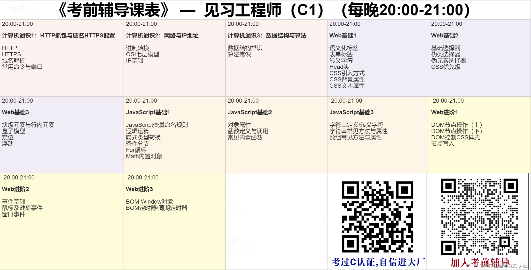 (1)直播串讲——由一线专家组织,基于精心打磨的任务文档、生动有趣的实操案例,用通俗易懂的语言为你讲透C认证的考纲考点。你的专属学习顾问会为你发放相应的课程表,并会在开播前给到直播链接,如果你因故错过直播,也可以与学习顾问联系,获取回放链接。