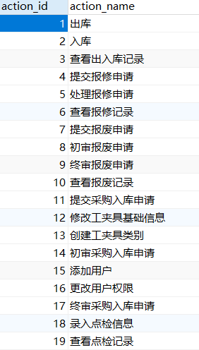 2、action(权限定义表),每条记录为一个权限(一个子菜单项),主要字段为: