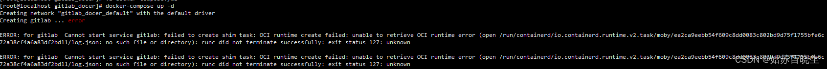 ERROR: for gitlab Cannot start service gitlab: failed to create shim task: OCI runtime create failed: unable to retrieve OCI runtime error (open /run/containerd/io.containerd.runtime.v2.task/moby/ea2ca9eebb54f609c8dd0083c802bd9d75f1755bfe6c72a38cf4a6a83df2bd11/log.json: no such file or directory): runc did not terminate successfully: exit status 127: unknown