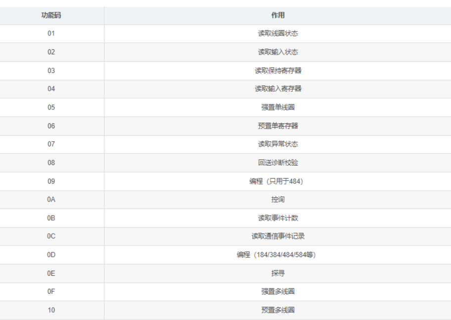 启动Modbus事务处理的客户机创建Modbus应用数据单元。功能码向服务器指示将执行哪种操作。