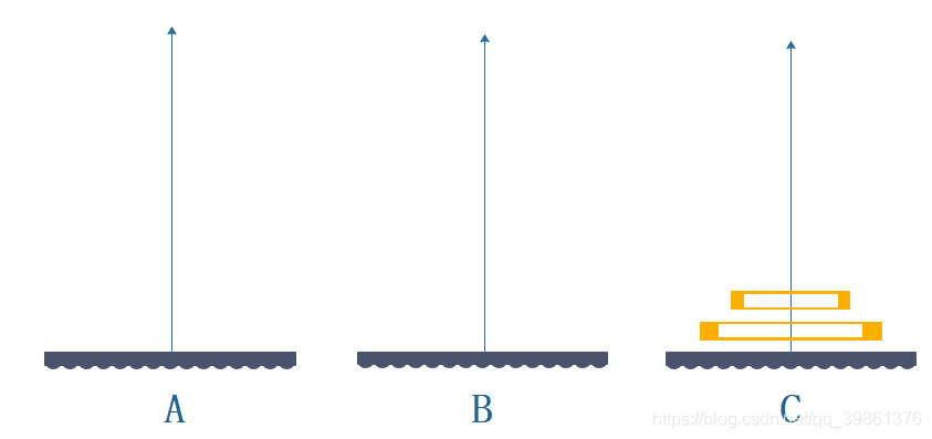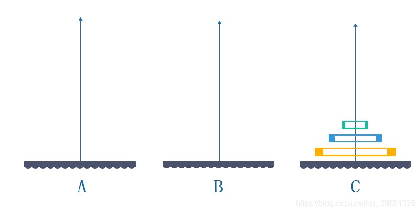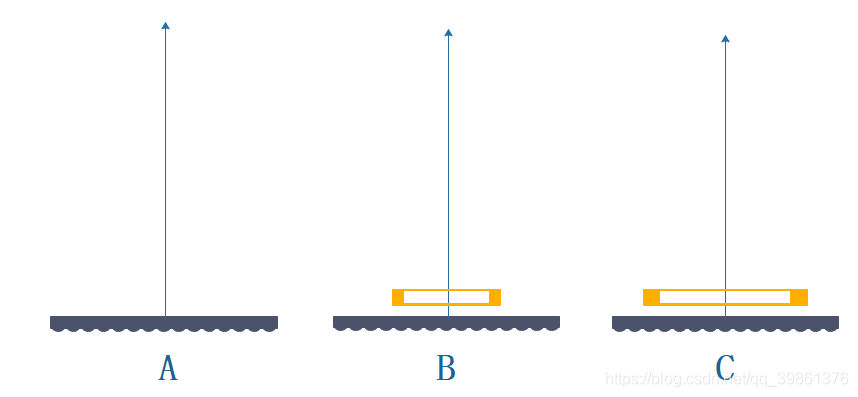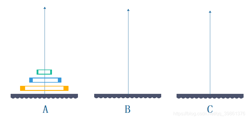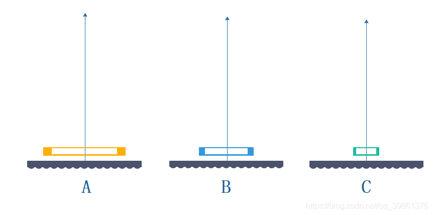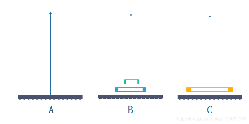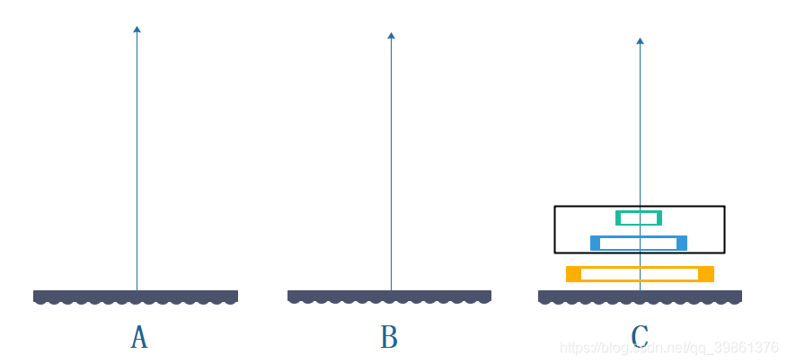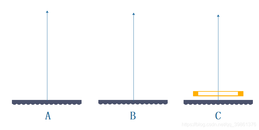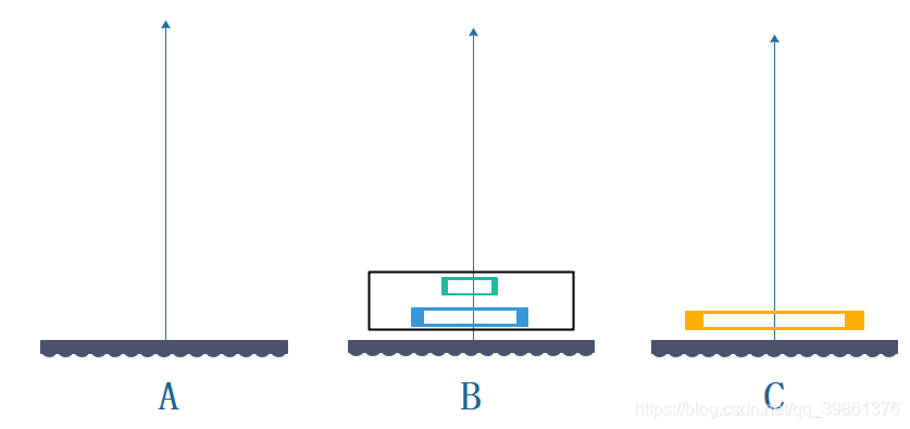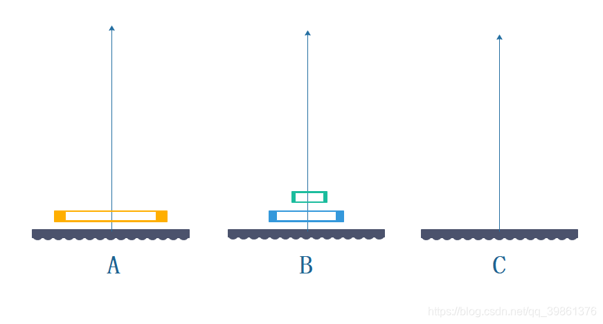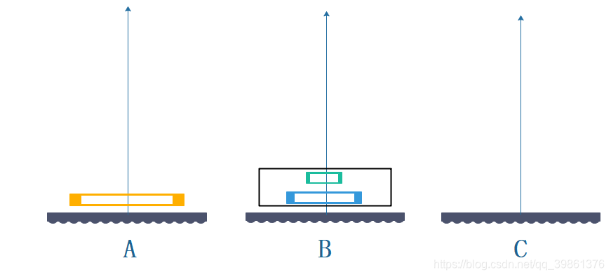 从这三步我们可以看出,我们这里将B作为一个缓冲柱来看待。先将小盘移到B,再将大盘移到C,然后再把小盘移到C。