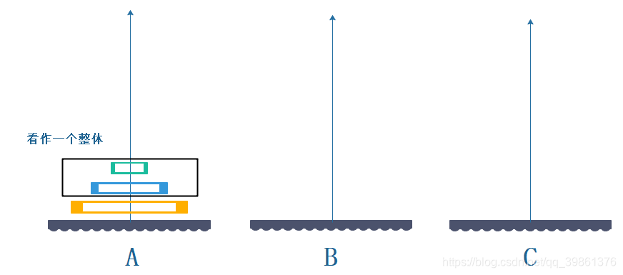 我们把前62个盘子看成一个整体,把前62个盘子从A柱移动到B柱,然后再把第63个大盘子从A柱移动到C柱,最后将B柱上的62个盘子堪称一个 整体移动到C柱上,就完成了63个盘子的移动。