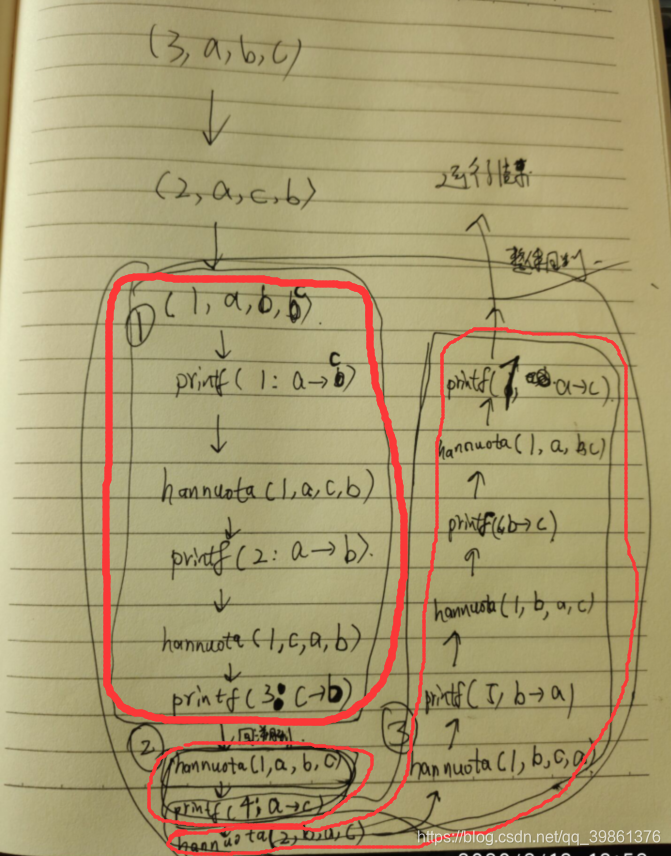 hannuota(n-1,b,a,c);//最后把B中的n-1个盘子看成一个整体移动到B