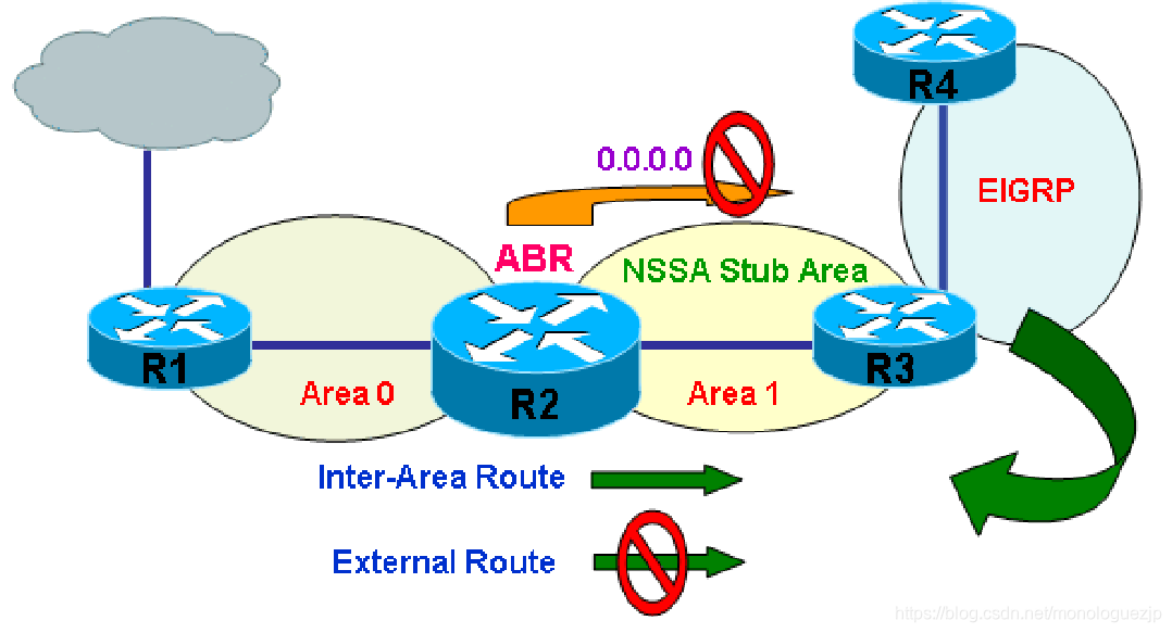 进入末节区域,同时也允许其它 OSPF 区域的路由(Inter-Area Route)进入 NSSA 区域,并且路由器还
