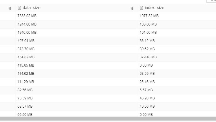可以看到排在前面几个的都是数据和索引占用比较大的,这时候就可以根据自身情况对这些表进行相应数据的删除操作