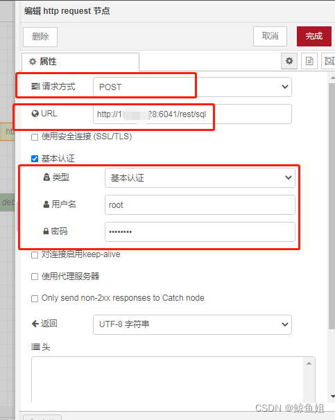 配置请求方式为post,url为http://IP:6041/rest/sql,基本认证为tDengine的数据库账户密码,本文为默认密码 root,taosdata。