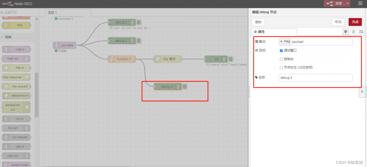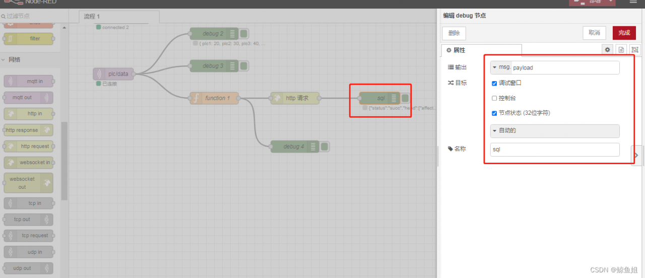 1. 发送mqtt消息到nodered的mqtt broker,使用nodered的mqtt in接收消息。详见NodeRed创建mqtt broker(mqtt服务器),并使用mqttx进行消息发送验证_鲸鱼姐的博客-CSDN博客