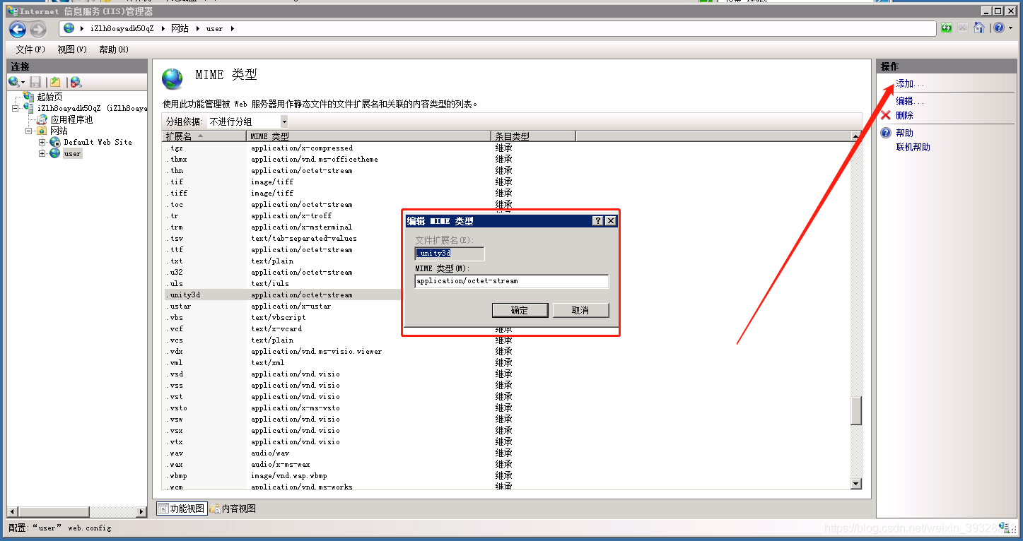 2. 打开 MIME 类型 (双击打开), 然后点击右上角操作里面的 “添加” , 如下图
