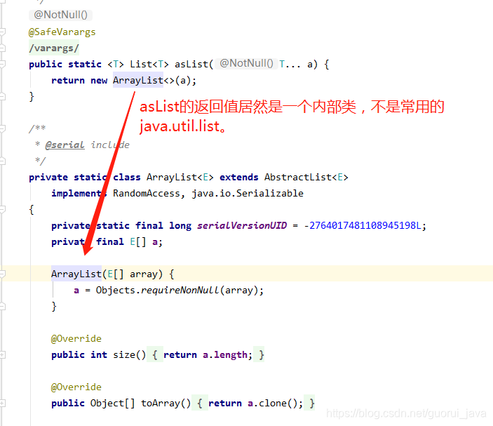 Arrays的内部类ArrayList和java.util.ArrayList都是继承AbstractList,remove、add等方法在AbstractList中是默认throw UnsupportedOperationException而且不作任何操作。