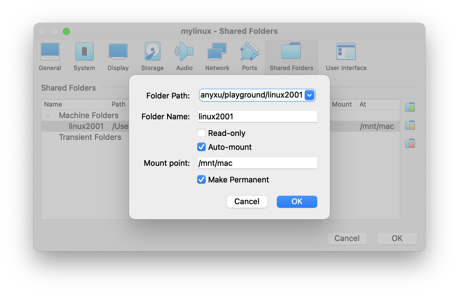 在mac和virtualbox之间共享文件可以通过virtualbox/linux界面的device->share folders进去设置。设置完成之后需要在linux上挂载相应的文件夹。我在mount的时候还遇到了一个问题。