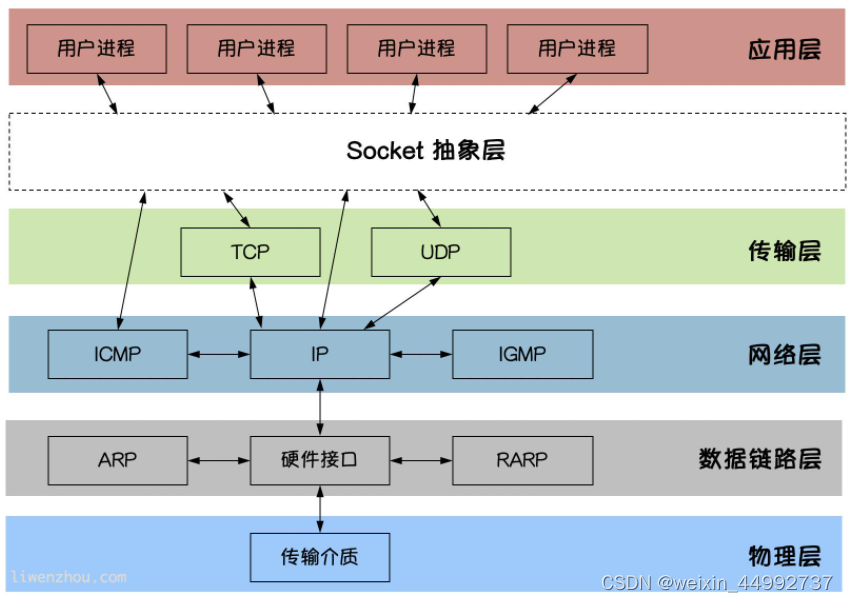 网络通信协议。 TCP/IP 是一个协议族,也是按照层次划分,共四层:应用层,传输层,互连网络层,网络接口层(物理+