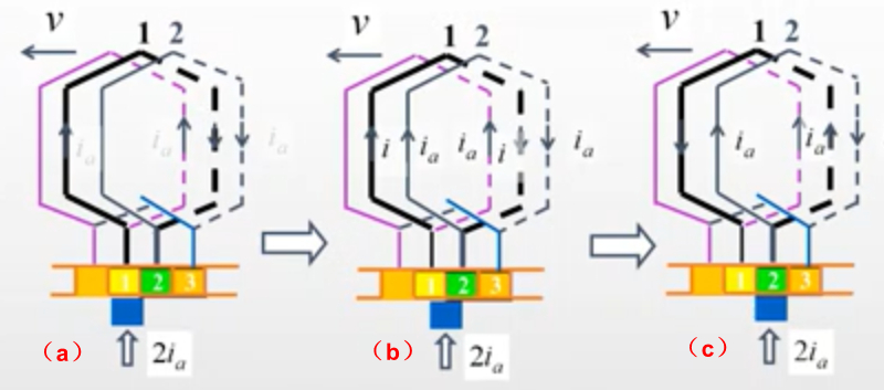 但在实际的上图(b)中,线圈 1 中的电流不为零。这是由于换向元件中存在各种感应电动势,如自感电动势 e