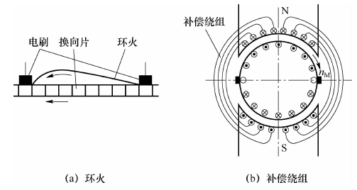 是指换向器上连接在正、负电刷之间的或由电刷至附近机座的强烈电弧,如下图(a)所示。产生环火时,电机呈短路状态,而且伴随着电弧产生的闪光、声响和高温,能在很短时间内烧坏电机。产生环火的